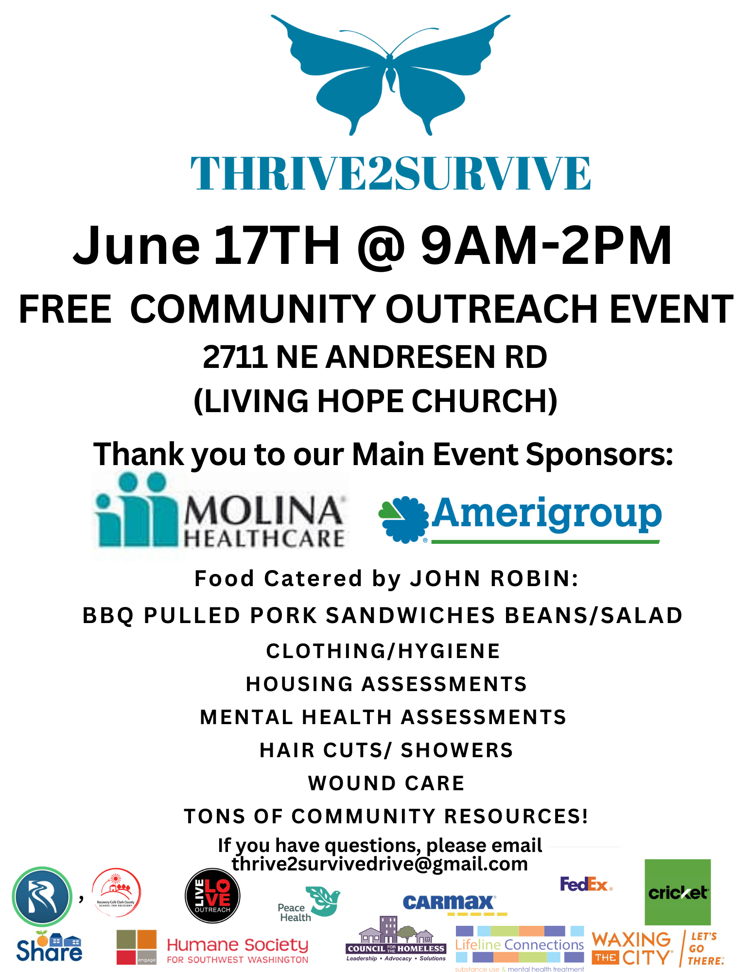 Thrive2Survive Community Outreach Saturday, June 17, 2023 9:00 AM 2:00 PM Living Hope Church 2711 Northeast Andresen Road Vancouver, WA, 98661 United States (map) Google Calendar ICS